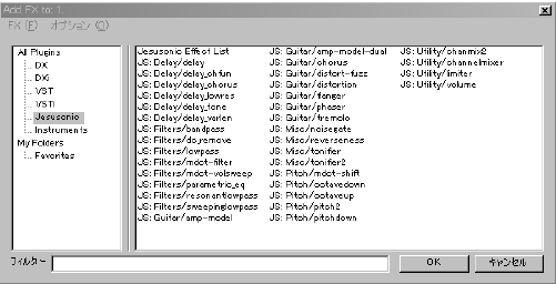 このようなウインドウが表示されると思いますので、"Jesusonic"→"JS: Delay/Delay"を選択して"OK"を押してください。JS: Delay/DelayとはReaperに内蔵されているディレイエフェクトです。