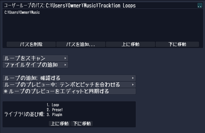 Tracktion7では「ループ」という音素材を使った作曲が簡単にできるようになっています。素材を持っている場合は、ここでループを一括して読み込むことで、作曲に使用することができるようになります。ループ素材がない場合、ループ素材を使わない場合はこの作業は不要です。